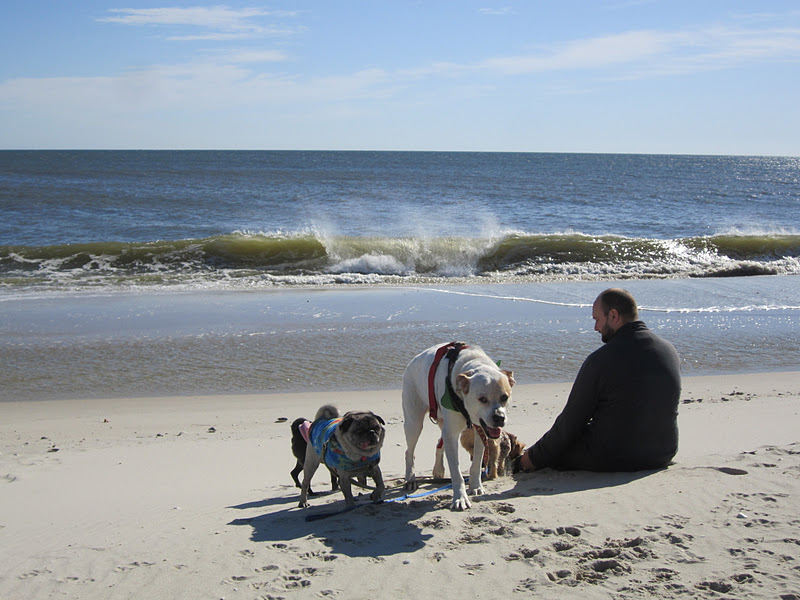 Then we took Norbert, Tubby, Ping and Dr. Zira to Island Beach state park.  It is about an hour and a half drive from our house so not so good for regular walks but nice for a once or twice  year outing.  We didn't bring Bob because sometimes there are a lot of off leash dogs running on the beach and he can be a little unpredictable with off leash dogs.  It was breezy and chilly down by the ocean early in the morning so the little dogs wore their jackets, it was a perfect time for Tubby and Ping to wear their Aloha Pug Snugglys.